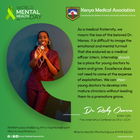 It advocates for the implementation of wellness programs, provides resources such as virtual webinars on Mental & Occupational Health, Physical exercise and Games - soccer, golf, team building activities, the KMA Choir etc and works to create a supportive community within the medical profession to ensure physicians thrive both personally and professionally.